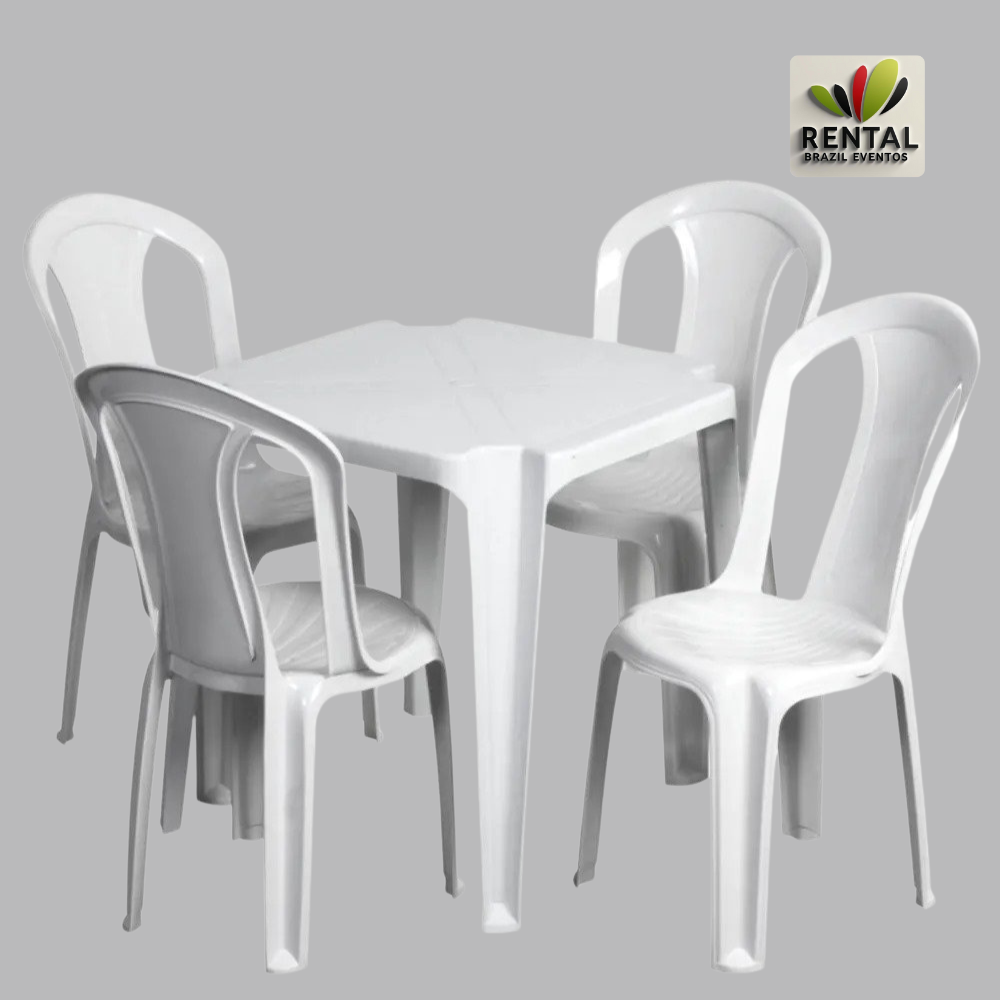 O conjunto de mesas e cadeiras plásticas para aluguel é composto por: